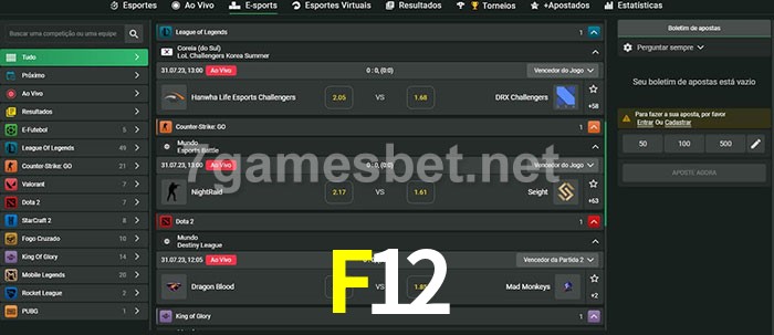 O F12 oferece uma grande seleção de opções de apostas em e-sports com probabilidades competitivas